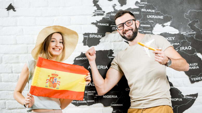 Couple of young travelers standing with spanish flag near the wall with world map, dreaming about summer vacations in Spain